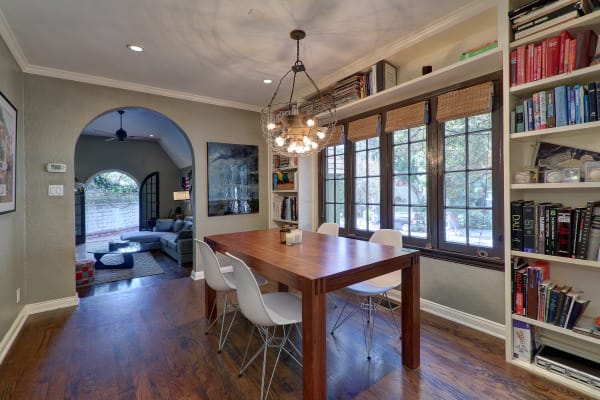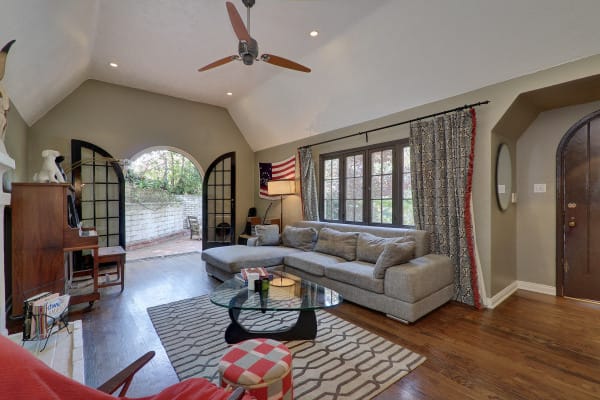 2 bedrooms, 1.5 bathrooms, bonus room, separate dining room, and large living room with high ceilings.