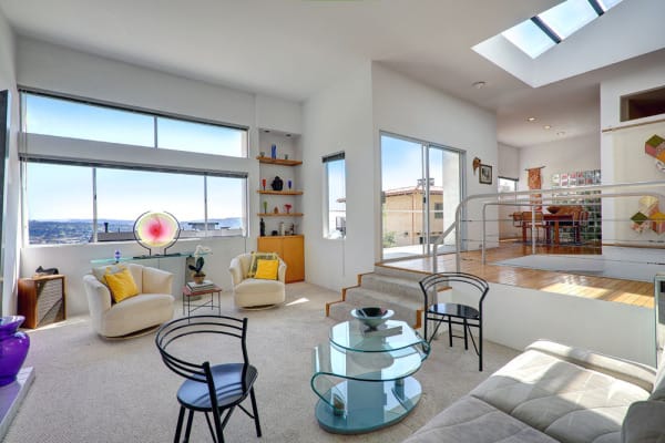 One of the area’s most-desired developers struck gold with this 1980 architectural wonder. Modernist builder Steven Hill’s elements and style are intact on the inside and outside of this unique, loft-like residence. Soaring light-filled spaces permeate the home. A contemporary, open floor plan showcases a two-story living room, dining room, kitchen, cocktail lounge, convertible den, balconies, decks, and spectacular city lights views from almost every room.