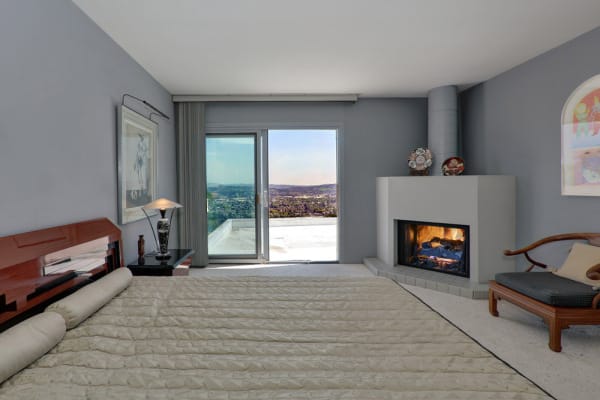 Higher up is the home’s master suite level. A large bedroom features a fireplace, walk-in closet, and a sliding glass door that opens to a view across the city’s lights to the San Gabriel mountain range. The master suite’s oversized bathroom features a separate tub and step-in shower large enough for two. Bonus alert: Bathe or shower while taking in city lights views through a picture window! A stack laundry unit is also on this level.