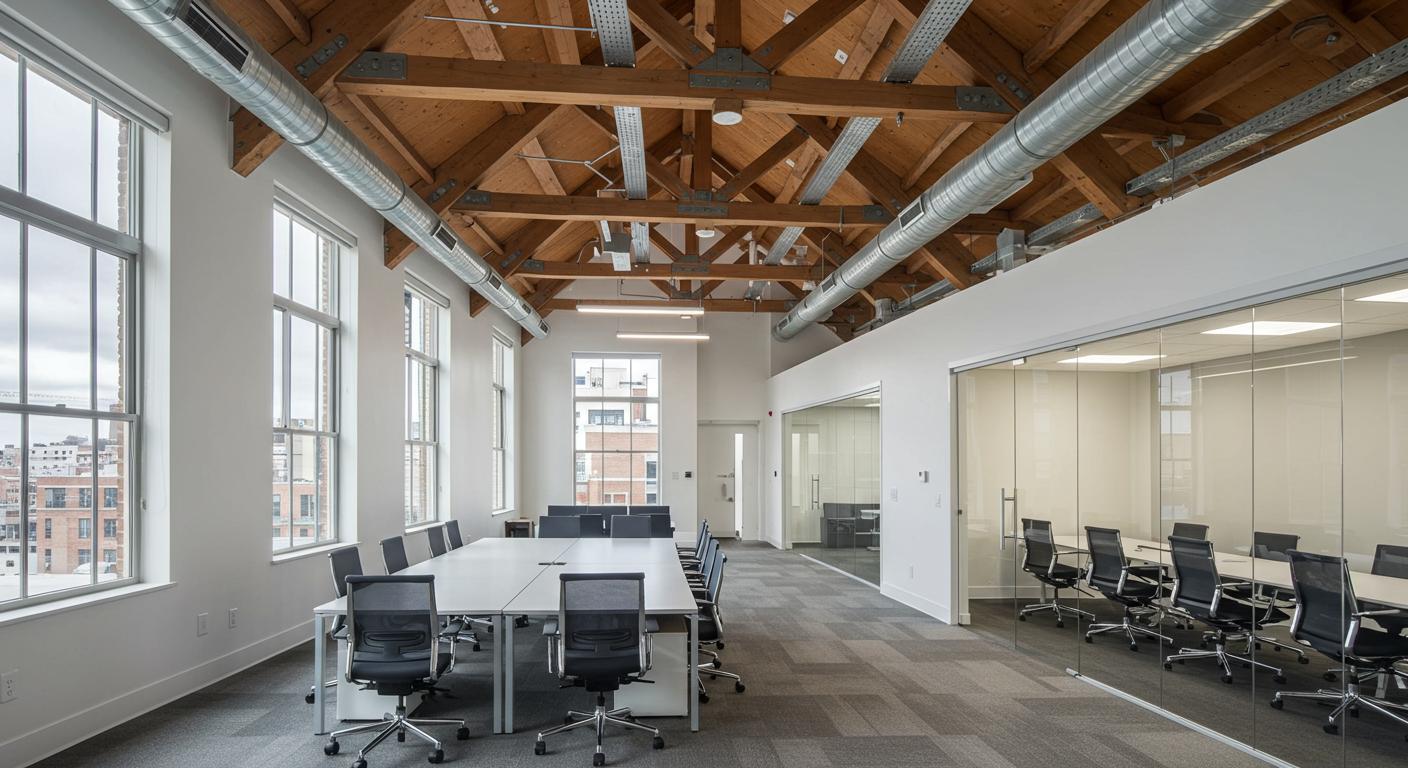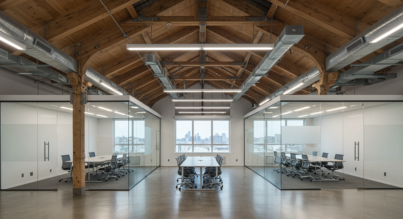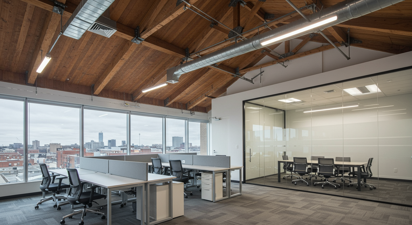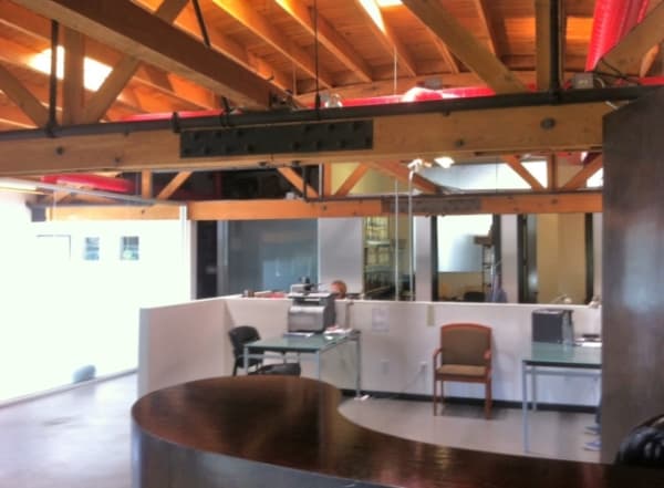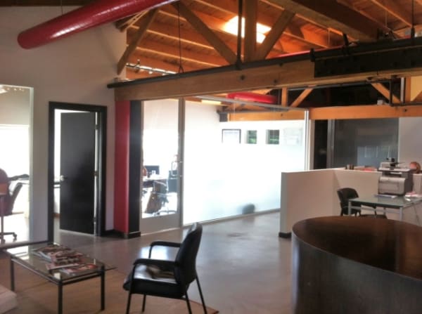 Fully built-out creative office with exposed wood bow-truss construction, high ceilings, 2 bullpen areas, a conference room, and 15 executive glass offices.