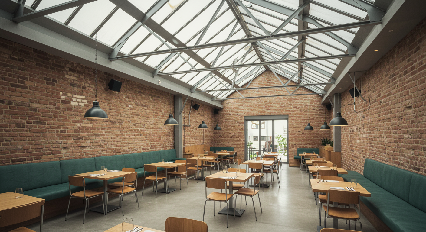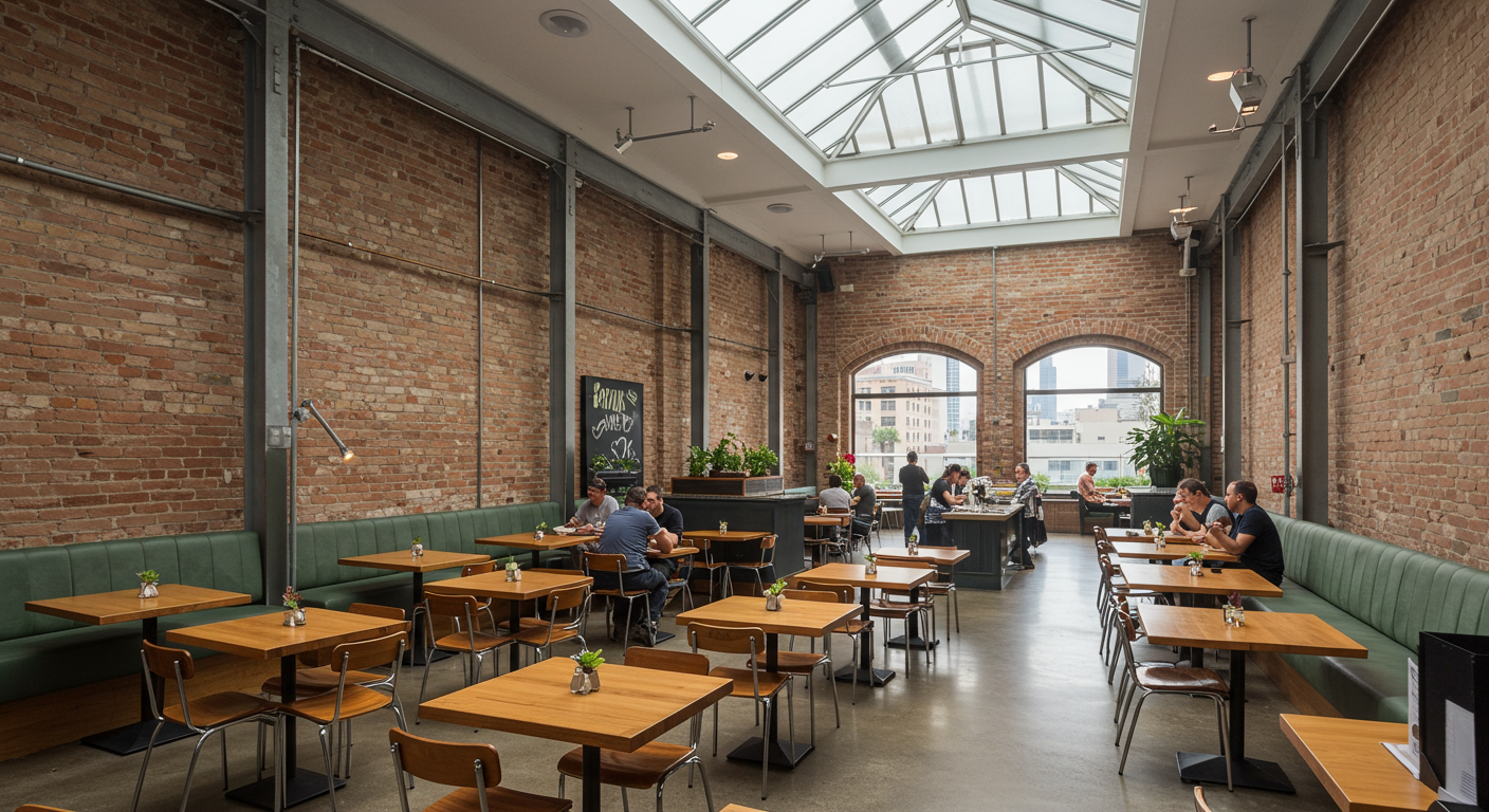 - 25-foot (estimated ) truss ceilings, massive skylights, floor-to-ceiling brick walls, concrete floors