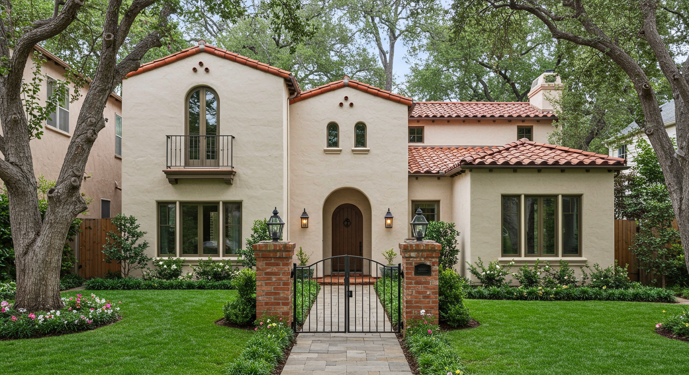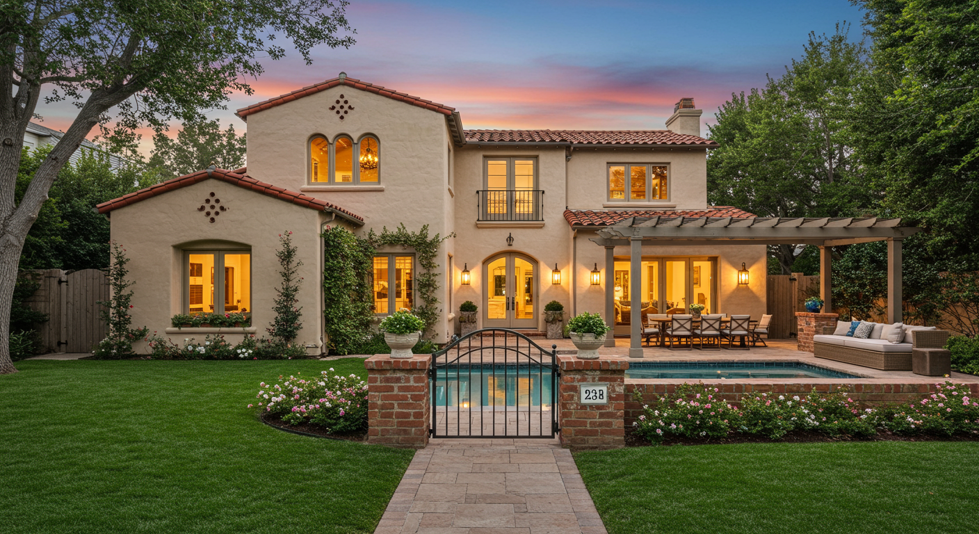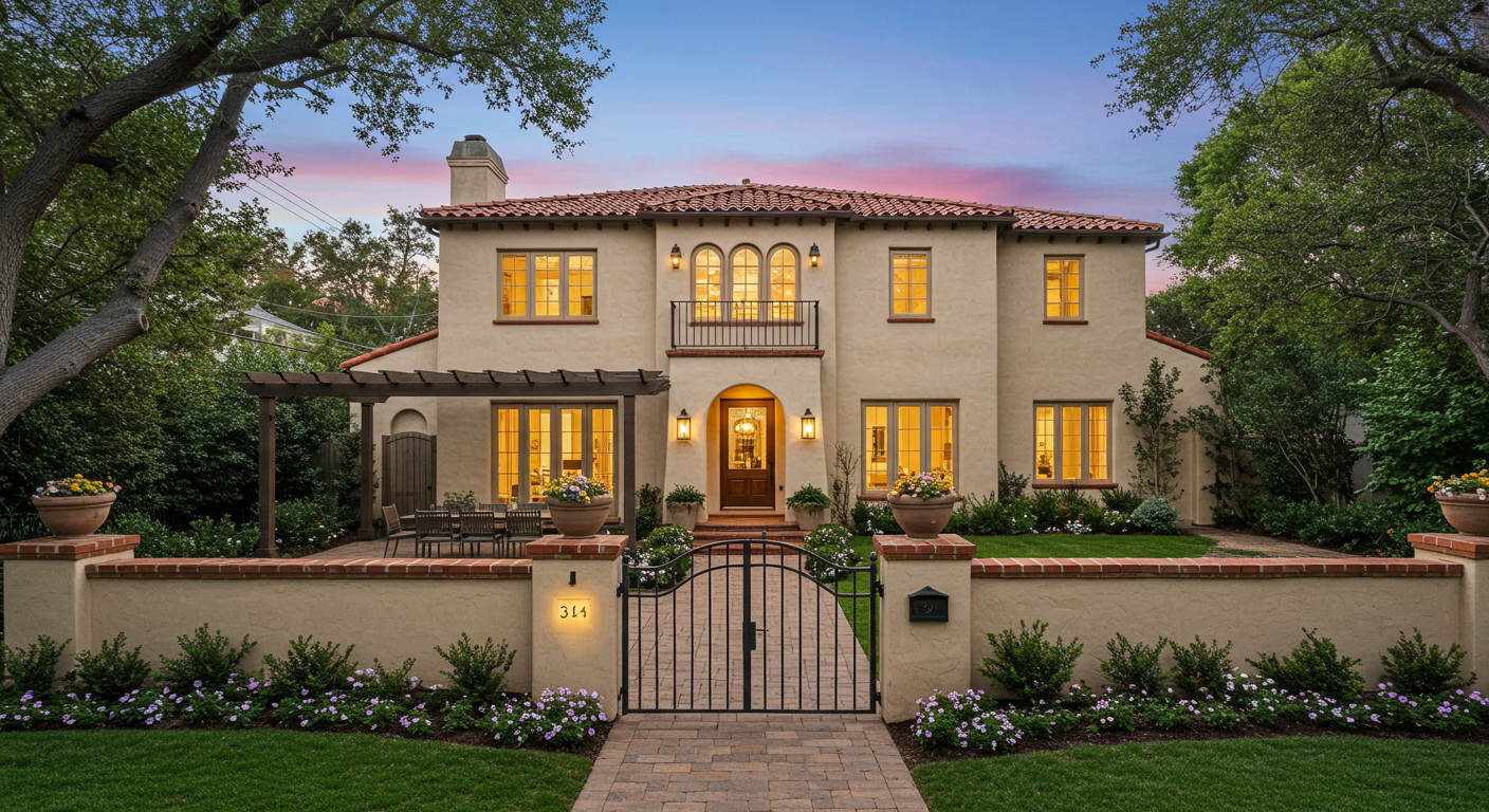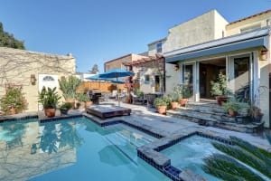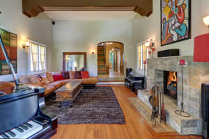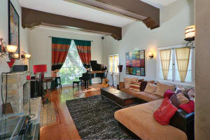 Set on a knoll with a gated driveway backyard, this gorgeous home contains enviable designer finishes including imported antique french terracotta tiles, Turkish travertine, & hand-painted flourishes. The house’s dramatic entry foyer opens to an impressive step-down living room with a two-story wood-beamed ceiling, refinished original wood floors, a stone fireplace, and a classic Spanish picture window looking out over the grassy front yard.