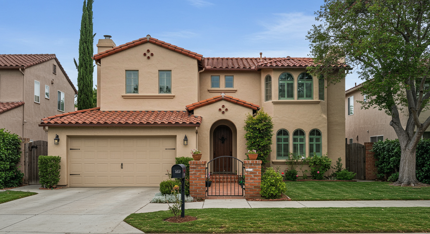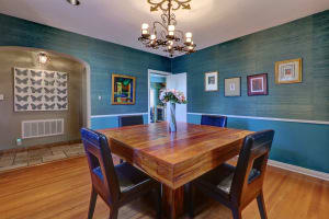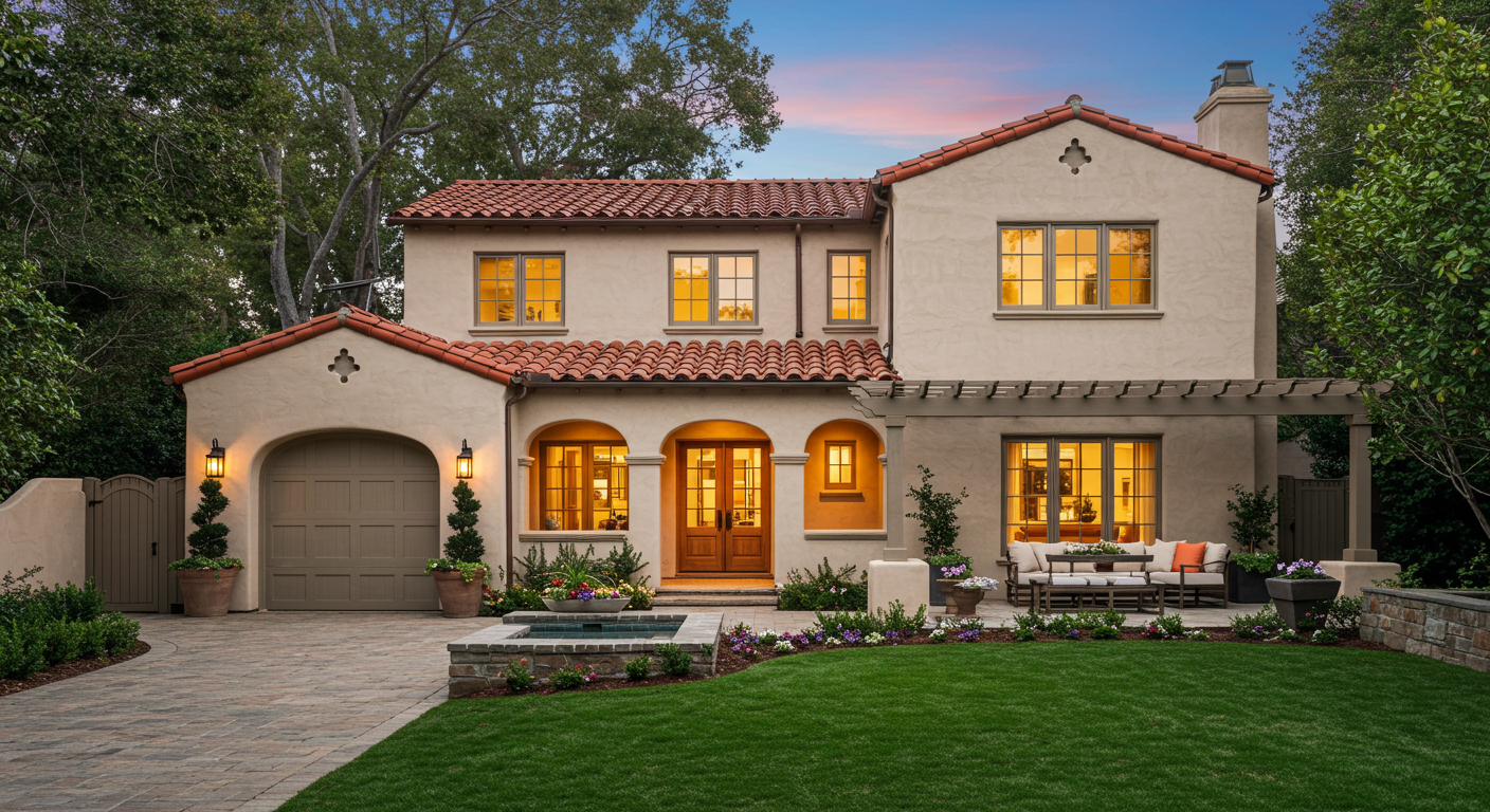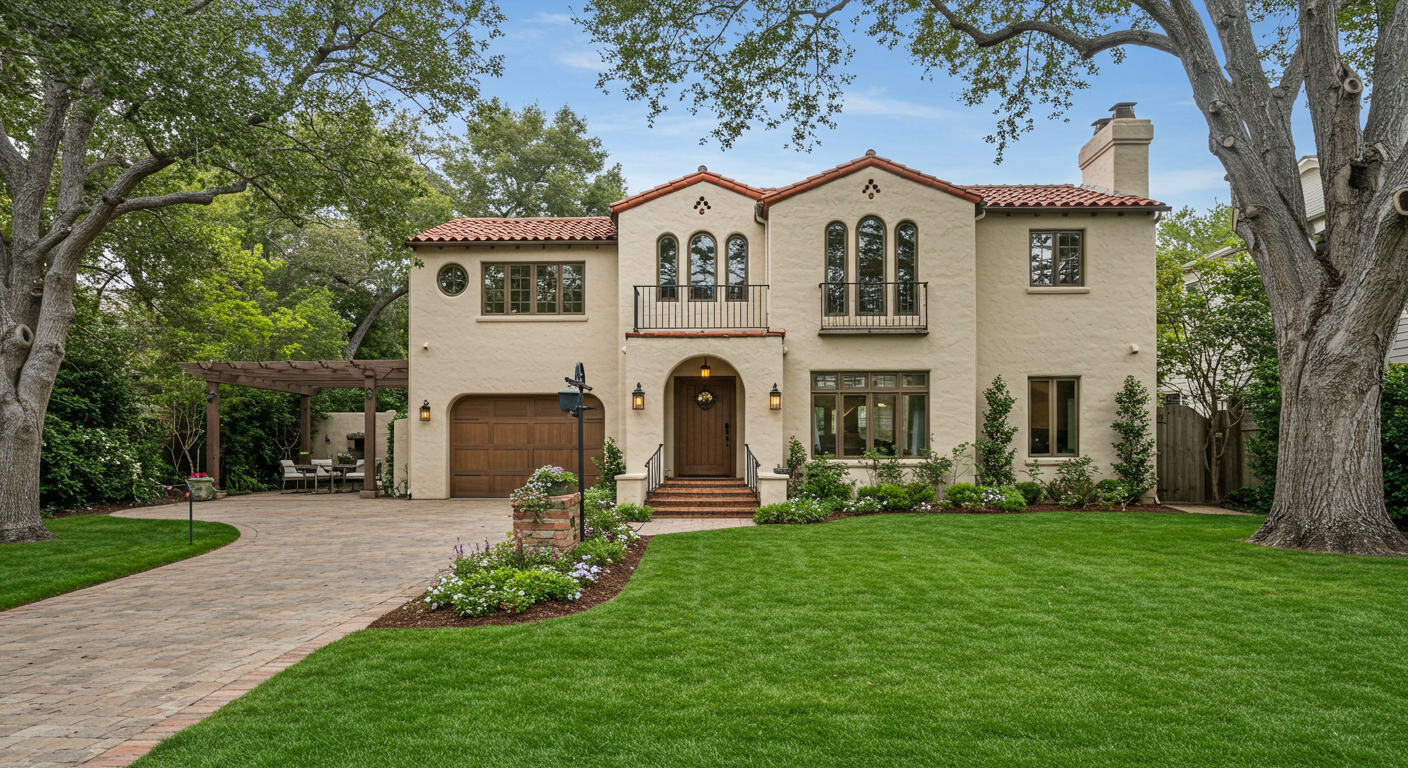 Set on a knoll with a gated driveway backyard, this gorgeous home contains enviable designer finishes including imported antique french terracotta tiles, Turkish travertine, & hand-painted flourishes. The house’s dramatic entry foyer opens to an impressive step-down living room with a two-story wood-beamed ceiling, refinished original wood floors, a stone fireplace, and a classic Spanish picture window looking out over the grassy front yard.