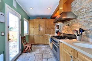 The residence’s formal dining room is light, bright, and exquisitely elegant. A large chef’s kitchen sports a Versailles-patterned travertine floor, farm sink, Jerusalem gold limestone countertops, ample custom cabinets (with self-closing drawers), a prep sink (perfect for feeding the pups, too), and top-of-the-line appliances (including fisher & Paykel dual-drawer dishwasher).