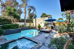 It’s an entertainer’s paradise outside in the back: a pergola-covered patio, lounging & dining areas, pool and spa, and outdoor shower.
