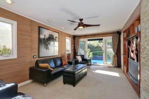 The home’s family room features a built-in entertainment center and sliding french doors to the backyard.